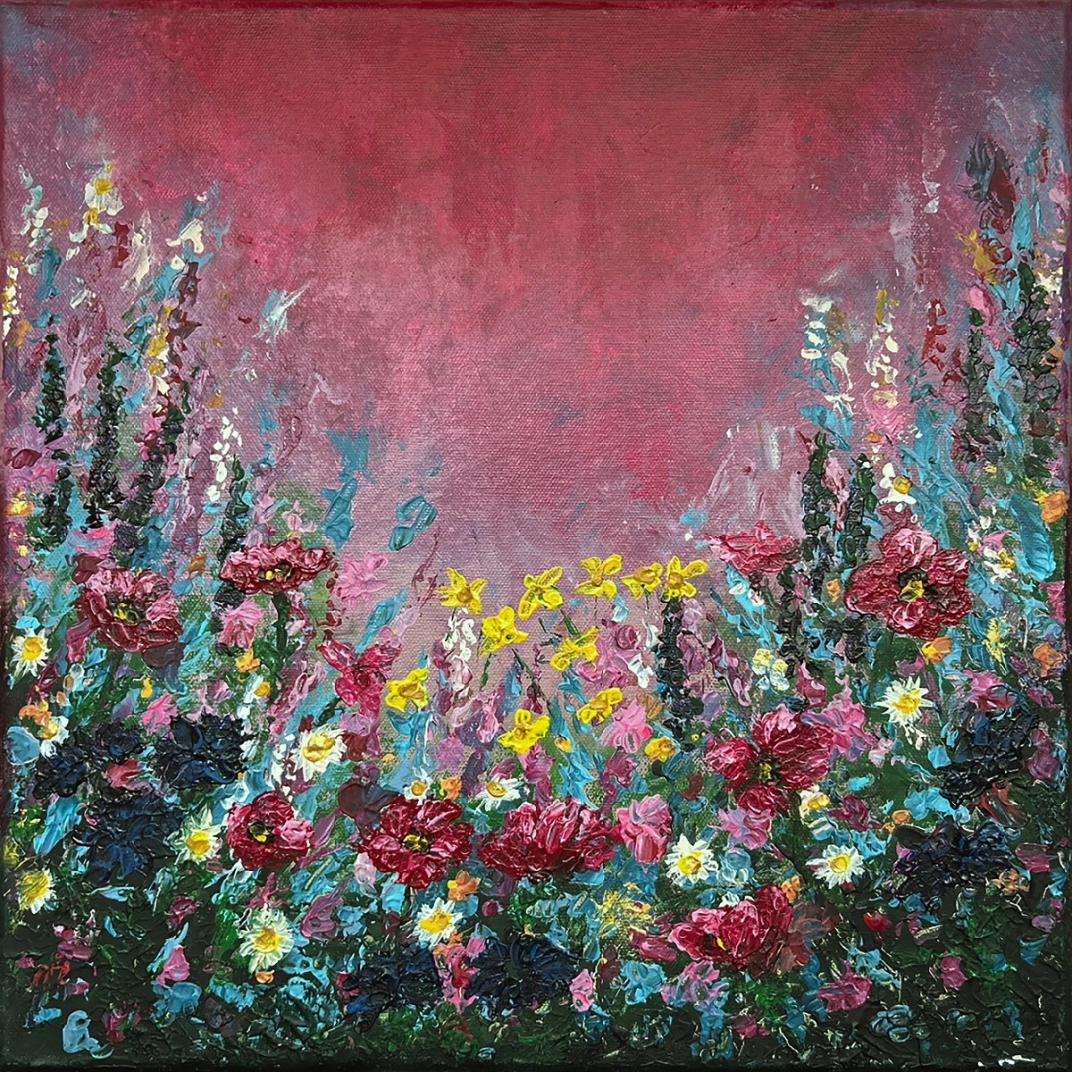 Na ognistym tle nieba o zmierzchu, mieniącego się odcieniami czerwieni i bordo, wyrasta bujny ogród polnych kwiatów. To chwila, w której dzika przyroda po raz ostatni oblewana jest blaskiem dnia i dogasającego słońca. Czerwona łąka to intensywna i pełna pasji celebracja piękna tej krótkiej, magicznej chwili.
