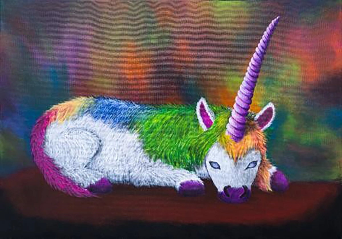Mityczne stworzenie zostało ukazane w chwili odpoczynku, emanując spokojem i subtelną, tęczową aurą. Jego futro zdaje się być utkane z barw — od czystej bieli po intensywne róże i czerwienie. Spoczywa na ciemnoczerwonej powierzchni, która kontrastuje z jego świetlistym umaszczeniem. Mroczniejsze tło ożywiają abstrakcyjne, falujące pasma koloru, potęgując wrażenie onirycznej, magicznej atmosfery. To obraz-symbol czystości, niewinności i niezwykłej mocy, ukazanych w momencie wyciszenia.