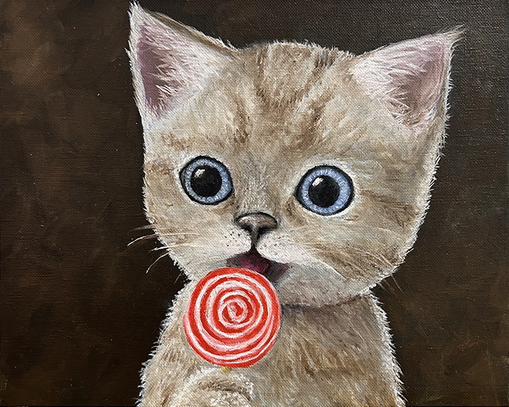 Czasami jedyne, czego potrzebujemy, by dzień stał się lepszy, to odrobina humoru. Lolli-cat to portret namalowany właśnie po to, by wywołać natychmiastowy uśmiech. Oddaje chwilę czystej, dziecięcej — a raczej kocięcej — radości i niewinności. W końcu kto powiedział, że sztuka zawsze musi być poważna?