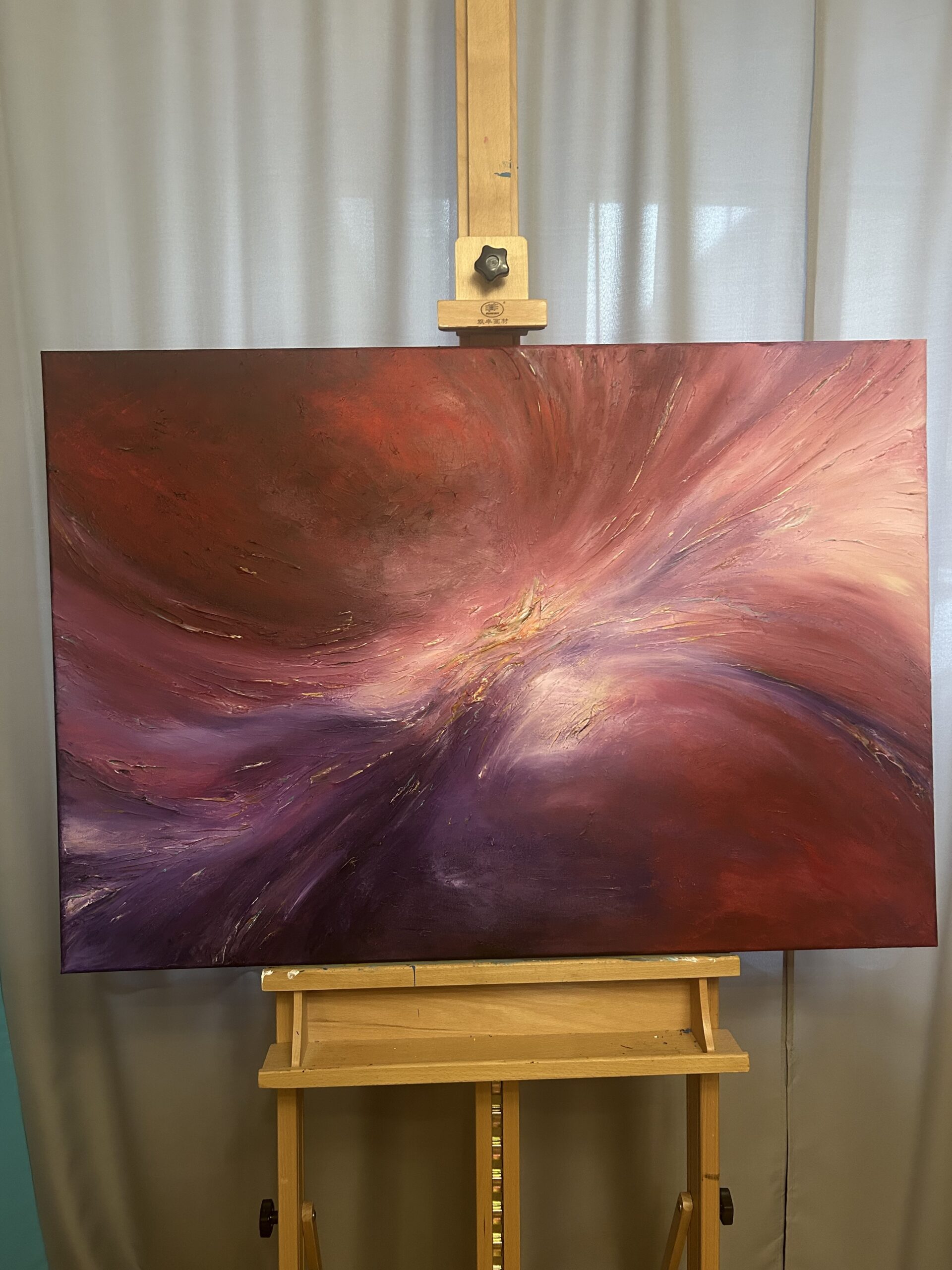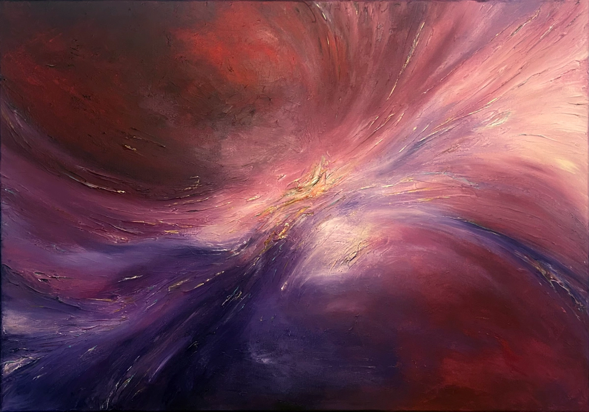 Obraz wciąga w głąb fioletowej mgławicy, gdzie kolory przechodzą w wirujące róże i ciepłe czerwienie, oddając ruch i dynamikę tych kosmicznych struktur. Złociste, białe i jasnożółte tony koncentrują się w centralnym punkcie, symbolizując jądro gwiazdy, która od teraz zaczyna świecić własnym światłem i rozpraszać mrok.