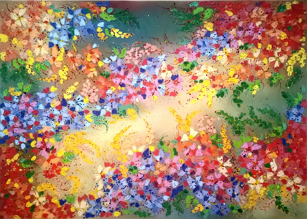 Eksplozja barw i pozytywnej energii przywodząca na myśl kwitnącą, letnią łąkę – z jej beztroską i poczuciem, że świat jest naprawdę pięknym miejscem. To właśnie tę czystą, niczym nieograniczoną radość życia i optymizm postanowiłem zamknąć w abstrakcyjnej formie, malując Pełnię Lata. Ten obraz natychmiast przyciąga wzrok soczystą mieszanką odcieni błękitu, fioletu, różu, czerwieni, żółci i zieleni, wypełniając przestrzeń pozytywną energią. Przez tę gęstwinę kolorów przebija się jasne tło, a drobne kropki dodają całości wibracji i dynamiki.