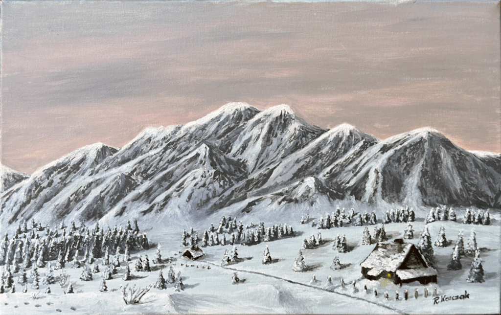 Obraz oddaje majestat ośnieżonych gór i ciszę, jaka w nich panuje. Kluczowy jest tutaj mały, oświetlony domek. To „pierwsze światło” nadziei i ciepła w nowej, nieznanej technice. Centralnym punktem pracy było odkrywanie, jak wiernie odtworzyć delikatny blask w oknie. Ten obraz to pamiątka pierwszych odważnych kroków w malarstwie i dowód na to, że nawet w surowym otoczeniu można znaleźć swoje własne źródło światła i ciepła.