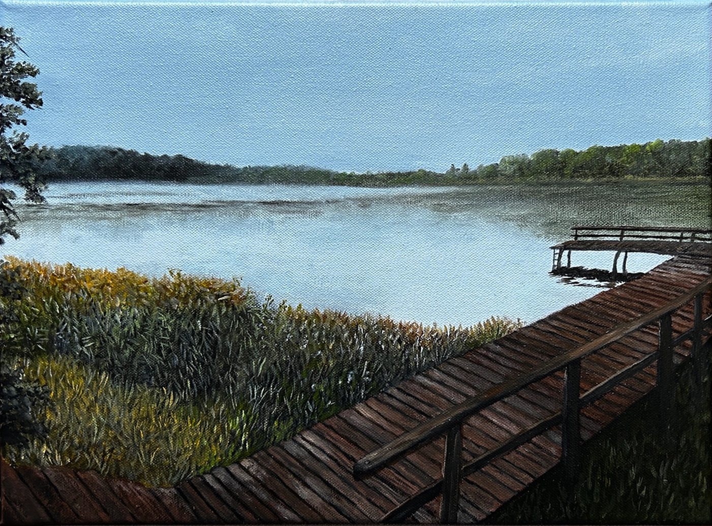 Po lewej stronie widać przygaszone barwy jesiennych szuwarów, które odgradzają ląd od chłodnej wody. Woda odbija ciężkie, pochmurne niebo, a w oddali majaczy niewyraźny zarys lasu. Scena emanuje ciszą, ale jest to cisza szczególna, przesycona samotnością. Perspektywa pomostu podkreśla odosobnienie, prowadząc wzrok ku bezkresnej tafli wody. Realistycznie oddana faktura drewna i roślinności kontrastuje z jednolitością jeziora.
