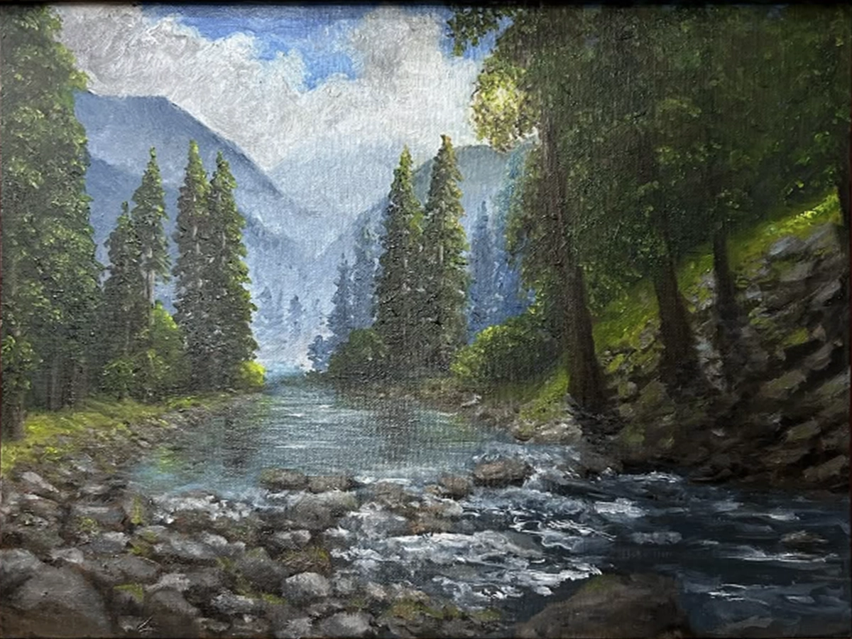 Na pierwszym planie wije się krystalicznie czysty potok, którego nurt z gracją omija omszałe kamienie. Brzegi potoku są porośnięte roślinnością, a w tle wznoszą się strzeliste, ciemnozielone drzewa iglaste. Ponad linią lasu majaczą zamglone, szaro-błękitne szczyty gór. Światło jest rozproszone, typowe dla gór, i delikatnie oświetla wodę, potęgując wrażenie świeżości i czystości. To obraz pełen spokoju, niemal medytacyjnej ciszy, który wnosi do wnętrza powiew świeżości i przypomina o pięknie tkwiącym w prostocie naturalnego świata.
