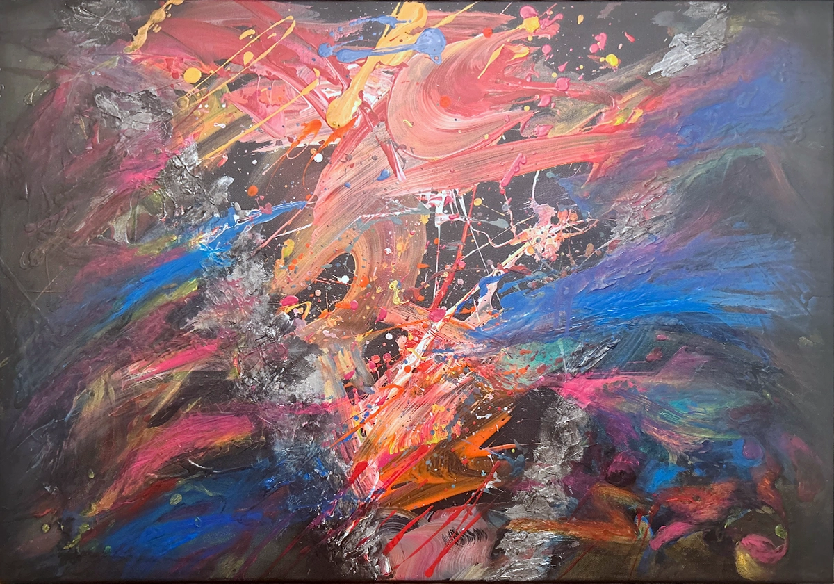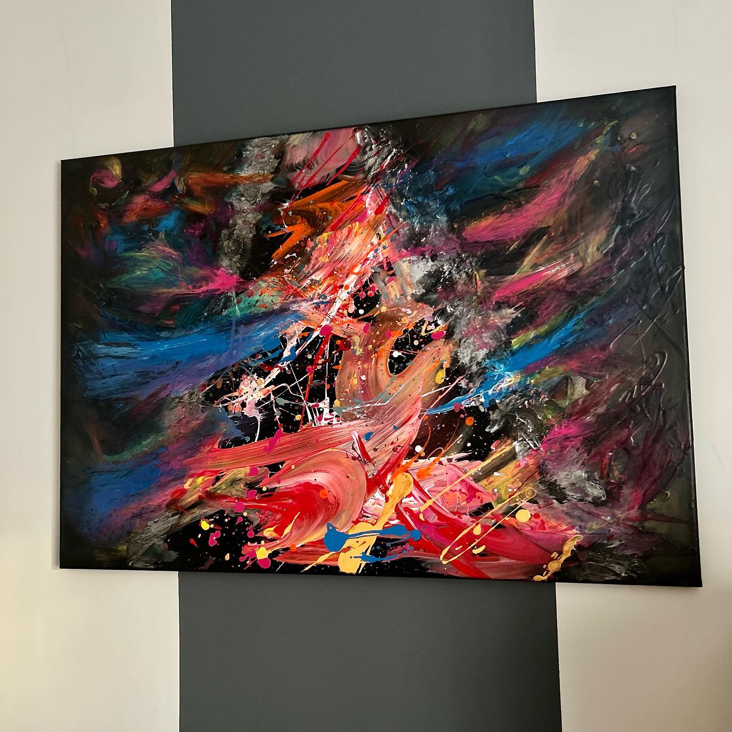 Z mrocznego tła, które symbolizuje pustkę, tryska feeria barw – ogniste czerwienie, słoneczne żółcienie, kosmiczne błękity i tajemnicze fiolety. Dynamiczne pociągnięcia pędzla i zróżnicowana faktura farby nadają obrazowi energię i sprawiają, że niemal czuć falę uderzeniową potężnej kosmicznej eksplozji. Metaliczne akcenty migoczą jak pierwsze drobiny kosmicznego pyłu. Ten wirujący chaos to akt najwyższej kreacji.