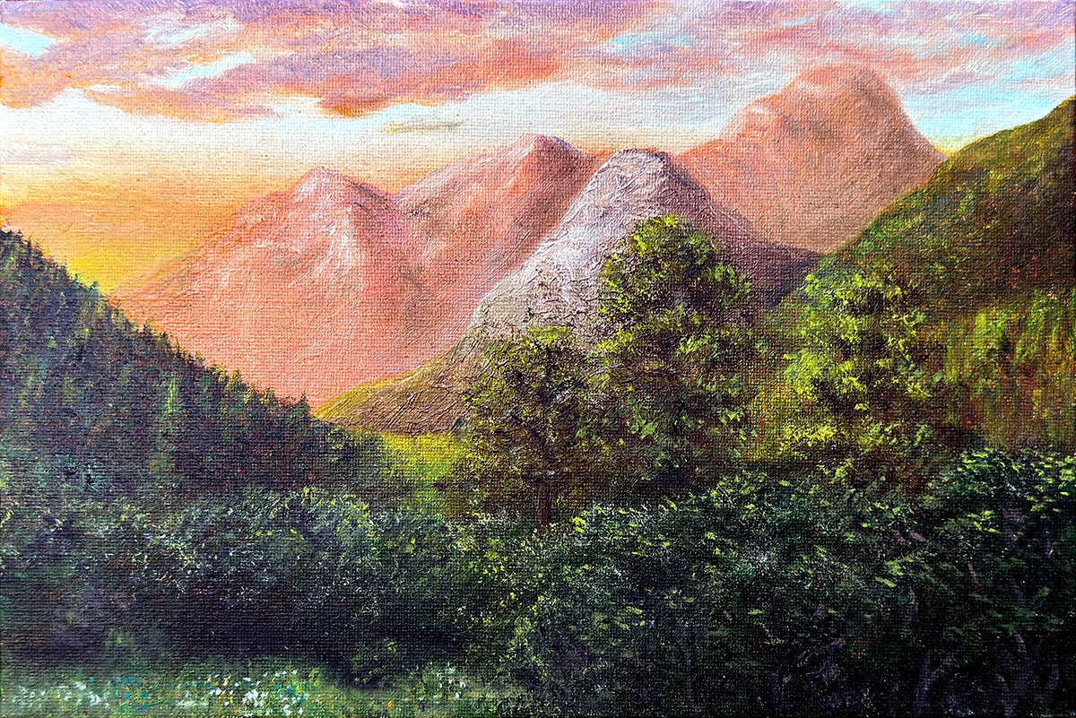 Na pierwszym planie dominuje bujna zieleń lasów i zarośli, która symbolizuje życie i witalność. W głębi, ponad linią drzew, wznoszą się majestatyczne, skaliste szczyty gór, skąpane w ciepłym, złotym świetle. To samo światło ożywia chmury, tworząc atmosferę pełną ciepła i spokoju. Obraz ukazuje harmonijny kontrast między życiodajną zielenią doliny a surowym majestatem górskich szczytów.