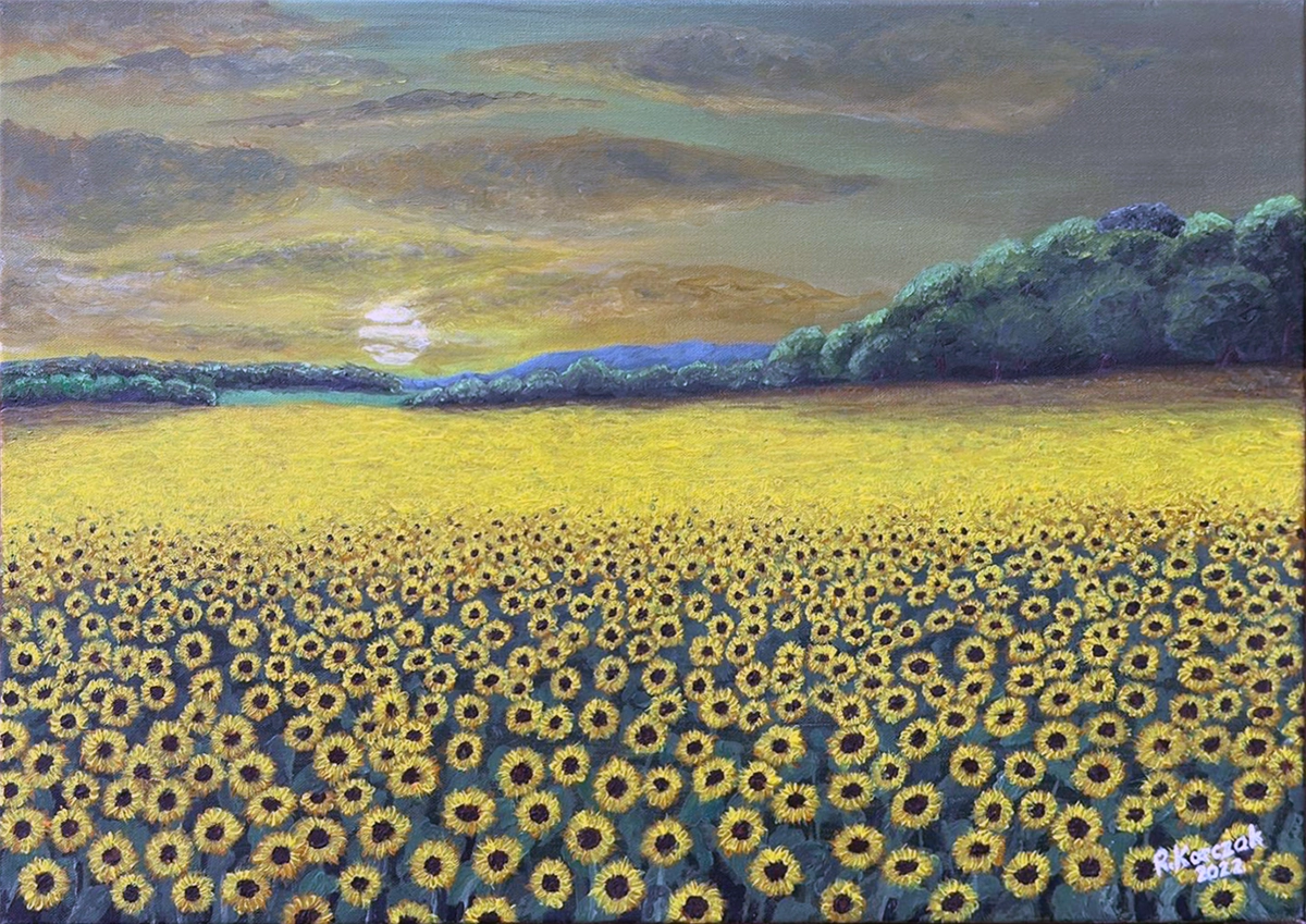 Poważne, ciężkie chmury zbierają się na niebie – potężne, zdolne zasłonić zachodzące słońce. Któż jednak wygra z beztroską radością pola słoneczników, które zdają się jaśnieć własnym blaskiem? A może w Złotej godzinie wcale nie chodzi o walkę, a o harmonię?